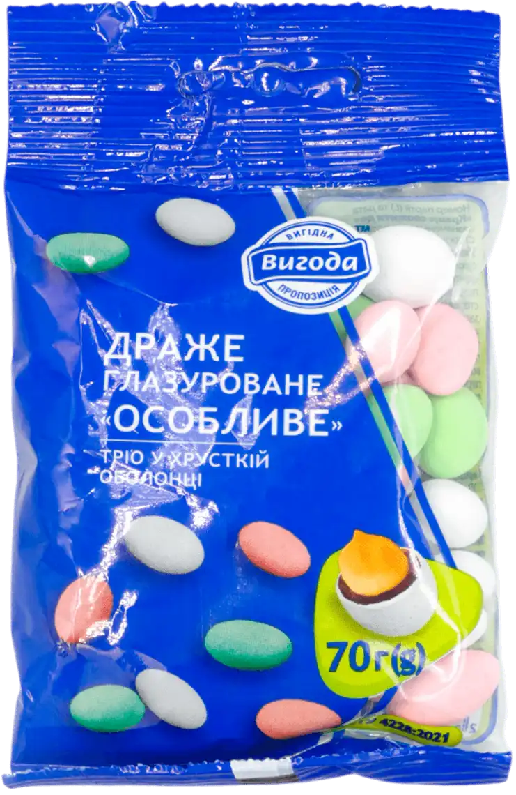 Драже Вигода Особливе Арахіс у шоколаді та глазурі - це смачні ласощі, які складаються з арахісу, вкритого солодким шоколадом і глазур'ю. Арахіс - це горіх, який багатий на білок, жири та вітаміни. Він надає драже текстури та ніжного горіхового смаку.Арахісове зерно покривається шаром молочного або гіркого шоколаду. Шоколадне покриття надає продукту солодкого і насиченого смаку, а також створює контраст із хрустким арахісом.Драже поєднує в собі різні текстури - хрустку оболонку від шоколаду та глазурі й ніжну м'якоть арахісу. Це створює цікаве відчуття в роті.Цей продукт чудово підходить як перекус між прийомами їжі. Він насичує, втамовує солодкий зуб і приносить задоволення.Драже Вигода Особливе Арахіс пропонує солодкий і ароматний смак, який задовольнить ваш апетит на солодке. Воно також надає білок та енергію з арахісу, що робить його приємними та поживними ласощами.