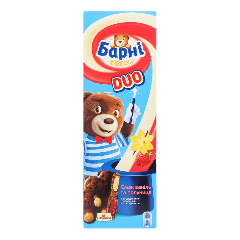 Борошно пшеничне, сироп глюкозно-фруктозний, цукор, яйце, олія ріпакова, вода питна, вологоутримуючий агент (гліцерин), молоко сухе знежирене і молоко сухе незбиране, пюре яблучне концентроване, пюре полуничне (2.4%), какао-порошок зі зниженим вмістом жиру, декстроза, крохмаль пшеничний, регулятор кислотності (карбонати калію, цитрат натрію, яблучна кислота, лимонна кислота), розпушувач (пірофосфат натрію), емкльгатори (ефіри гліцерину молочної та жирних кислот, ефіри полігліцеридів і жирних кислот, соєвий лецитин), сіль кухонна, ароматизатори, загущувачі (ксантанова камедь, гуарова камедь), сік концентрований з ягід бузини.Борошно пшеничне, сироп глюкозно-фруктозний, цукор, яйце, олія ріпакова, вода питна, вологоутримуючий агент (гліцерин), молоко сухе знежирене і молоко сухе незбиране, пюре яблучне концентроване, пюре полуничне (2.4%), какао-порошок зі зниженим вмістом жиру, декстроза, крохмаль пшеничний, регулятор кислотності (карбонати калію, цитрат натрію, яблучна кислота, лимонна кислота), розпушувач (пірофосфат натрію), емкльгатори (ефіри гліцерину молочної та жирних кислот, ефіри полігліцеридів і жирних кислот, соєвий лецитин), сіль кухонна, ароматизатори, загущувачі (ксантанова камедь, гуарова камедь), сік концентрований з ягід бузини.