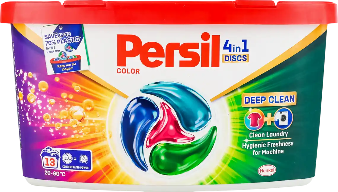 Диски Persil Deep Clean 4в1 для прання кольорових речей - глибоке очищення та яскраві кольори ваших речей після кожного циклу прання. Диски Persil видаляють навіть найглибші плями, не пошкоджуючи при цьому тканину. Кожна з чотирьох камер в диску містить потужну формулу, розроблену для роботи у 4 ключових напрямках: видалення плям, забезпечення довготривалої свіжості, яскравості одягу та догляд за тканиною. А ще з оновленою формулою допомагають вашій пральній машині залишатися гігієнічно чистою. Просто покладіть диск у барабан вашої пральної машини та отримайте всі переваги використання пральних засобів від Persil. Нові компактні пральні капсули Discs забезпечують високу ефективність чищення зі зменшеною кількістю матеріалів необхідних для виробництва, сприяючи поліпшенню сталості середовища. Формула Persil допомагає забезпечити ефективне видалення забруднень, зберігаючи при цьому яскравість одягу, навіть після декількох циклів прання.