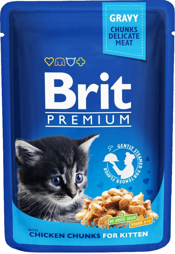 Корм Brit premium Pouches chicken chunks for kitten шматочки c куркою - вологий корм класу преміум для кошенят. Краса, здоров'я і життєва сила.Рекомендації по годівлі: У тварини завжди повинен бути доступ до свіжої питної води. Перед годуванням продукт повинен бути доведений до кімнатної температури.