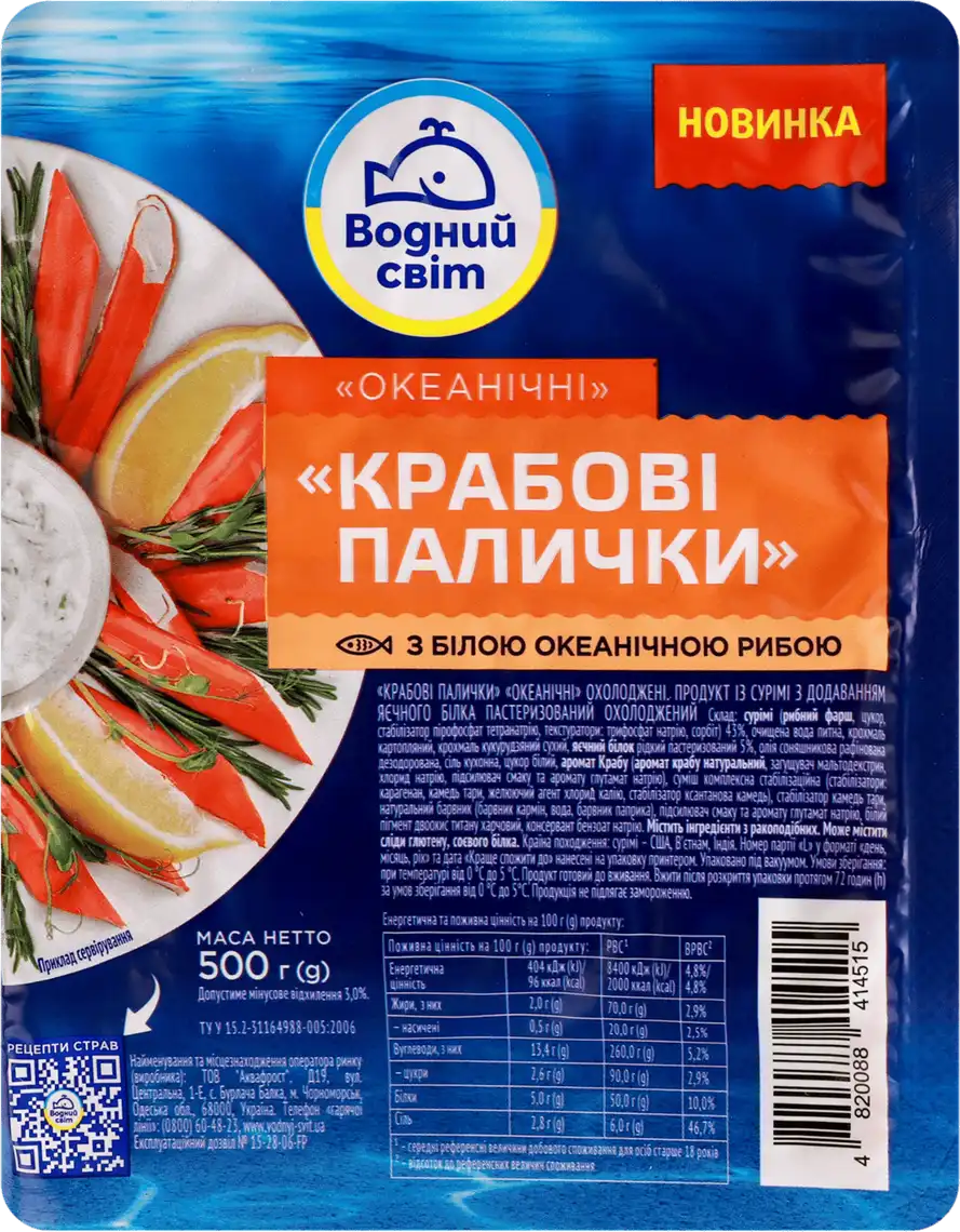 Заморожені крабові палички ТМ" Водний Світ " виготовлені з філе білої океанічної риби і насичені вітамінами, мінералами і омега 3. Палички упаковані під вакуумом і дуже прості у своєму використанні: вони можуть виступати, як в якості самостійної закуски, так і входити до складу різноманітних страв - від супів до салатів.