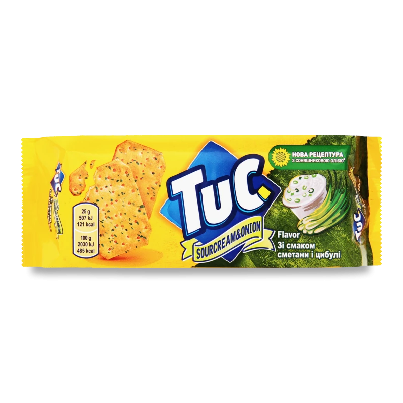 Крекер солоний Sour cream & Onion Tuc. У упаковці на 100 грам. Склад: Борошно пшеничне, олія соняшникова, вода питна, сироп глюкозний, ароматизатор "Сметана і цибуля" (цукор, порошок цибулі (0.6%), сіль кухонна харчова, борошно пшеничне, маслянка суха, декстроза, сметана суха (0.3%), регулятори кислотності (кислота лимонна, кислота молочна), порошок петрушки, ароматизатори, олія соняшникова, підсилювачі смаку та аромату (Е631, Е627)), розпушувачі (бікарбонату натрію та амонію), сіль кухонна (0.9%), покращувач борошна (натрію метабі) Харчові властивості на 100 грам: Калорійність – 508 ккал/2129 кДж; Жири – 23 г; Білки – 7.8 г; Вуглеводи – 66 г; Цукор – 5.7 г; Клітковина – 2.4 г; Сіль – 1.8 г; Насичені жирні кислоти – 2.2 г.Крекер солоний Sour cream & Onion Tuc. У упаковці на 100 грам. Склад: Борошно пшеничне, олія соняшникова, вода питна, сироп глюкозний, ароматизатор "Сметана і цибуля" (цукор, порошок цибулі (0.6%), сіль кухонна харчова, борошно пшеничне, маслянка суха, декстроза, сметана суха (0.3%), регулятори кислотності (кислота лимонна, кислота молочна), порошок петрушки, ароматизатори, олія соняшникова, підсилювачі смаку та аромату (Е631, Е627)), розпушувачі (бікарбонату натрію та амонію), сіль кухонна (0.9%), покращувач борошна (натрію метабі) Харчові властивості на 100 грам: Калорійність – 508 ккал/2129 кДж; Жири – 23 г; Білки – 7.8 г; Вуглеводи – 66 г; Цукор – 5.7 г; Клітковина – 2.4 г; Сіль – 1.8 г; Насичені жирні кислоти – 2.2 г.