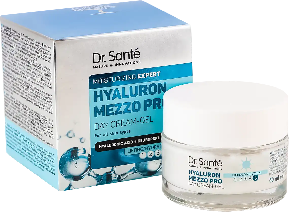 Денний крем-гель. Безін'єкційне потужне зволоження та ліфтинг-ефект, як після салонного догляду. Особливості Hyaluron Mezzo Pro Cream від бренду Dr. Sante: - збагачена гіалуроновою кислотою, нейропептидами, рослинним пребіотиком, а також зволожуючими рослинними екстрактами формула; - забезпечує швидке та тривале зволоження протягом 72 годин; - усуває лущення та відчуття стягнутості; - знімає почервоніння; - підтримує здорову мікрофлору епідермісу; - підвищує еластичність шкіри; - надає ботокс-ефект, зменшуючи глибину мімічних зморшок та носогубних складок; - усуває тьмяність і надає обличчю здорового сяйва.