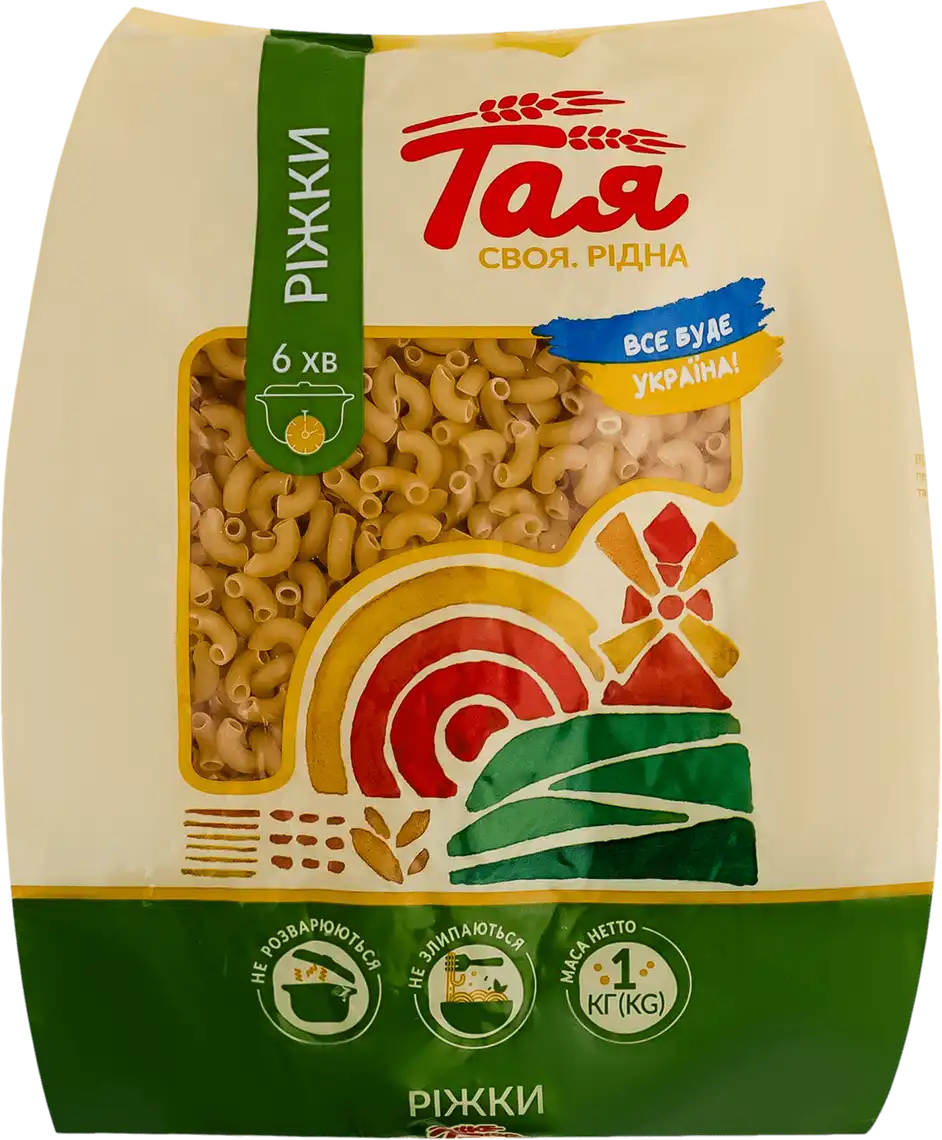 Макаронні вироби Тая Ріжки — це якісний і універсальний продукт, виготовлений з пшеничного борошна вищого ґатунку та питної води, що забезпечує відмінний смак і поживність. Ріжки мають зігнуту, напівкруглу форму, яка чудово утримує соуси та інші інгредієнти, роблячи їх ідеальними для приготування запіканок, гарнірів, салатів та супів. Технологія виробництва цих макаронів дозволяє зберегти їхню форму навіть після варіння: вони не розварюються і не злипаються, залишаючись окремими та пружними. Високоякісне борошно вищого сорту забезпечує продукту приємний золотистий відтінок та легкий пшеничний аромат, що добре доповнює смак основної страви. Завдяки відсутності штучних барвників, консервантів і домішок, макарони Тая Ріжки є натуральним і корисним вибором для всієї родини.