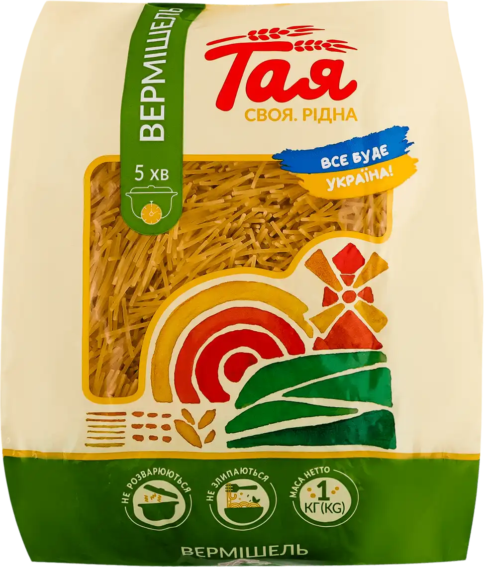 Макаронні вироби Тая Вермішель — це якісна продукція українського виробника, створена для тих, хто цінує смак і якість у кожній страві. Виготовлена з пшеничного борошна вищого ґатунку та чистої питної води, вермішель відзначається золотистим кольором та приємним, легким смаком, що не перебиває, а вдало доповнює інші інгредієнти. Тонка й довга форма робить її ідеальною для супів, гарнірів, а також страв азійської кухні, додаючи текстуру та насиченість кожній ложці. Особлива технологія виробництва, яка включає ретельне пресування і сушіння, допомагає зберігати структуру та смак продукту, не допускаючи розварювання або злипання під час приготування. Вермішель Тая швидко готується та добре тримає форму, роблячи процес приготування легким і приємним. Завдяки відсутності штучних добавок, барвників або домішок, вермішель є натуральною і підходить для всієї родини.