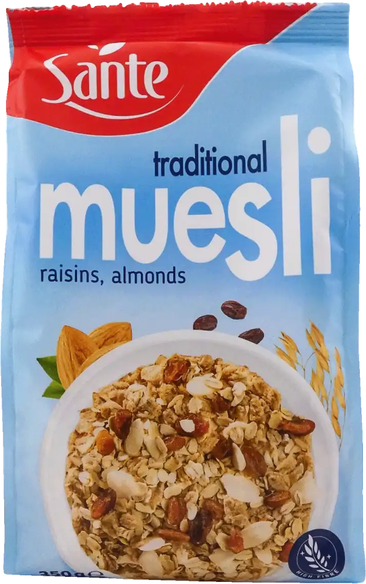 Мюслі - це унікальна суміш смажених та сирих вівсяних пластівців у двох смаках. Ви можете вибрати пластівці з великими шматочками сухофруктів або сумішшю родзинок і мигдалю. Жоден із варіантів продукту не містить штучних підсолоджувачів, барвників, консервантів, емульгаторів або глутаматів. Навпаки, мюслі є відмінним джерелом клітковини, мінералів, тіаміну та ніацину, які підтримують здоров'я та життєву силу. Побалуйте себе здоровим та корисним сніданком з мюслі та молоком, йогуртом або кефіром.