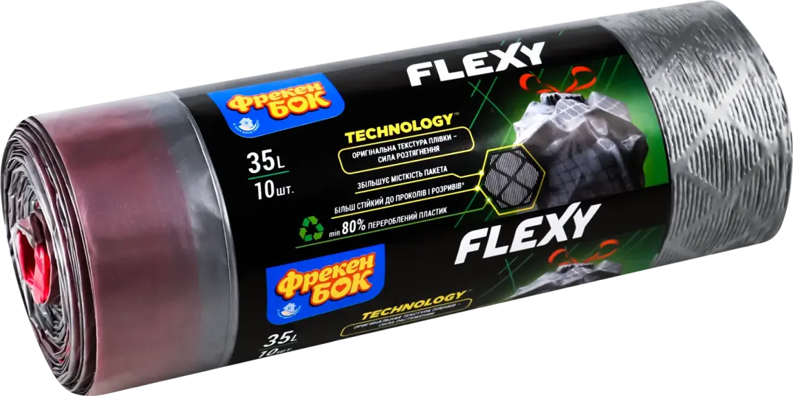 Пакети для сміття із затяжками Flexy ТМ Фрекен БОК для господарських цілей (упаковка, транспортування, зберігання побутових відходів). Підходять для стандартного відра. Зручні, місткі, особливо міцні та надійні. Оригінальна текстура плівки дозволяє пакету розтягуватися, щоб протистояти розривам, проколам та протіканню. Виготовлені із повторно переробленого пластику.