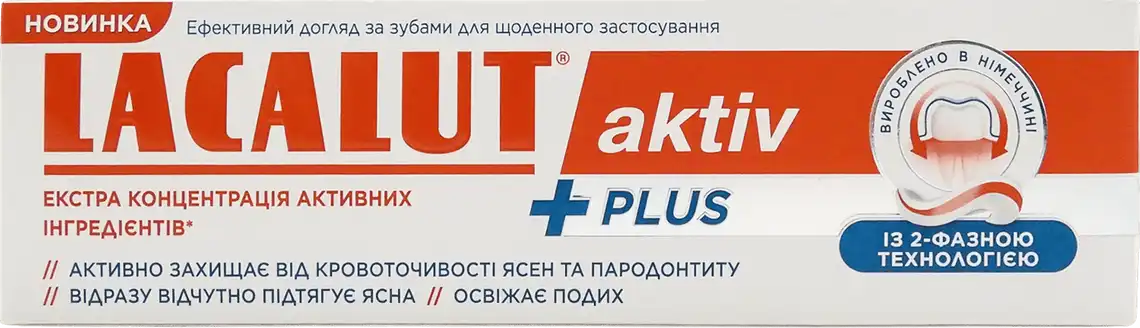 Lacalut Activ Plus містить перевірену формулу Lacalut Activ з більшою концентрацією активних інгредієнтів. 2-фазна технологія: біла фаза активно підтягує та зміцнює ясна вже з першого застосування. Гідроксіапатит ремінералізує та зміцнює зубну емаль; червона фаза усуває неприємний запах із рота і робить дихання свіжим.