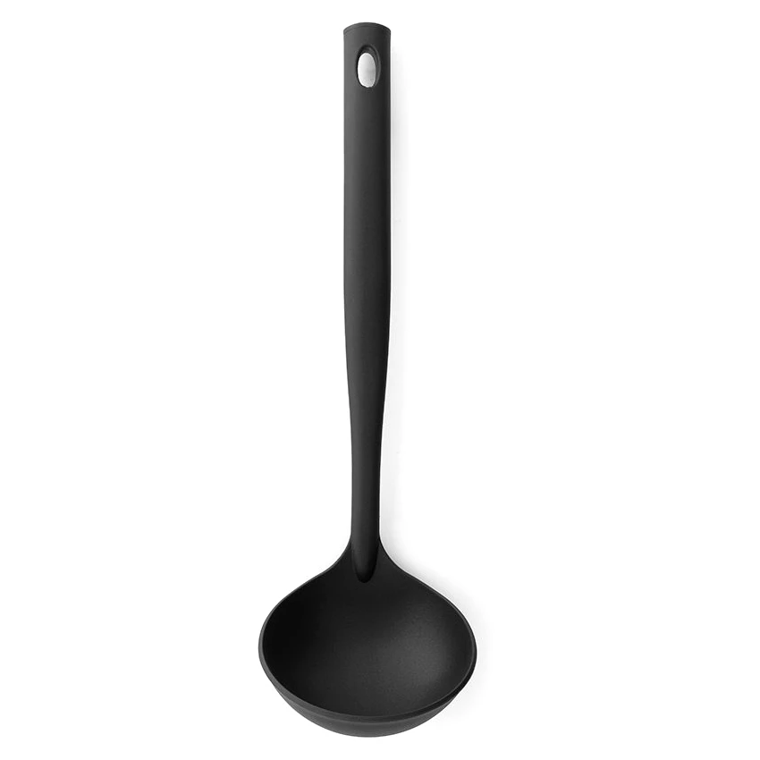 Половник Brabantia, 33.5 см (00840013) Половник Brabantia Black Line довжиною 33.5 см (артикул 00840013) — це високоякісний та стильний кухонний інструмент, що стане незамінним помічником для розливання супів, соусів, рагу та інших рідких страв. Він поєднує в собі довговічність, ергономічність та елегантний дизайн, який чудово впишеться в сучасний інтер'єр кухні. Високоякісні матеріали та продуманий дизайн Цей половник Brabantia виготовлений з міцного та термостійкого нейлону, що робить його ідеальним для використання з посудом, що має антипригарне покриття. Нейлон не дряпає поверхню, значно подовжуючи термін служби ваших каструль та сковорідок. Цей матеріал витримує високі температури (зазвичай до 220°C), є гігієнічним, не вбирає запахи та не впливає на смак їжі. Серія Black Line, як випливає з назви, характеризується стильним чорним кольором, який надає половнику стриманого, сучасного та мінімалістичного вигляду. Ергономічна ручка забезпечує зручний та нековзний хват, а її оптимальна довжина 33.5 см дозволяє легко працювати з глибокими ємностями, запобігаючи обпіканню рук. Зручність та простота у догляді Половник Brabantia Black Line відрізняється практичністю у щоденному використанні. Його оптимальна глибина чаші дозволяє зачерпувати достатню порцію рідини, а продумана форма забезпечує акуратне розливання без проливань. Цей інструмент легкий у догляді — його можна мити як вручну під проточною водою, так і в посудомийній машині, що значно спрощує його експлуатацію. Наявність спеціального отвору для підвішування дозволяє зручно зберігати половник, заощаджуючи місце на кухонному рейлінгу. Характеристики: Тип: Половник Бренд: Brabantia Серія: Black Line Матеріал: Високоякісний термостійкий нейлон Довжина: 33.5 см Колір: Чорний Термостійкість: До 220°C (орієнтовно) Особливості: Безпечний для посуду з антипригарним покриттям Елегантний та сучасний дизайн Ергономічна ручка для комфортного хвату Отвор для підвішування Легкий у догляді, можна мити в посудомийній машині Гігієнічний, не вбирає запахи Призначення: Розливання супів, соусів, рагу, бульйонів, напоїв. Половник Brabantia, 33.5 см (00840013) Половник Brabantia Black Line довжиною 33.5 см (артикул 00840013) — це високоякісний та стильний кухонний інструмент, що стане незамінним помічником для розливання супів, соусів, рагу та інших рідких страв. Він поєднує в собі довговічність, ергономічність та елегантний дизайн, який чудово впишеться в сучасний інтер'єр кухні. Високоякісні матеріали та продуманий дизайн Цей половник Brabantia виготовлений з міцного та термостійкого нейлону, що робить його ідеальним для використання з посудом, що має антипригарне покриття. Нейлон не дряпає поверхню, значно подовжуючи термін служби ваших каструль та сковорідок. Цей матеріал витримує високі температури (зазвичай до 220°C), є гігієнічним, не вбирає запахи та не впливає на смак їжі. Серія Black Line, як випливає з назви, характеризується стильним чорним кольором, який надає половнику стриманого, сучасного та мінімалістичного вигляду. Ергономічна ручка забезпечує зручний та нековзний хват, а її оптимальна довжина 33.5 см дозволяє легко працювати з глибокими ємностями, запобігаючи обпіканню рук. Зручність та простота у догляді Половник Brabantia Black Line відрізняється практичністю у щоденному використанні. Його оптимальна глибина чаші дозволяє зачерпувати достатню порцію рідини, а п