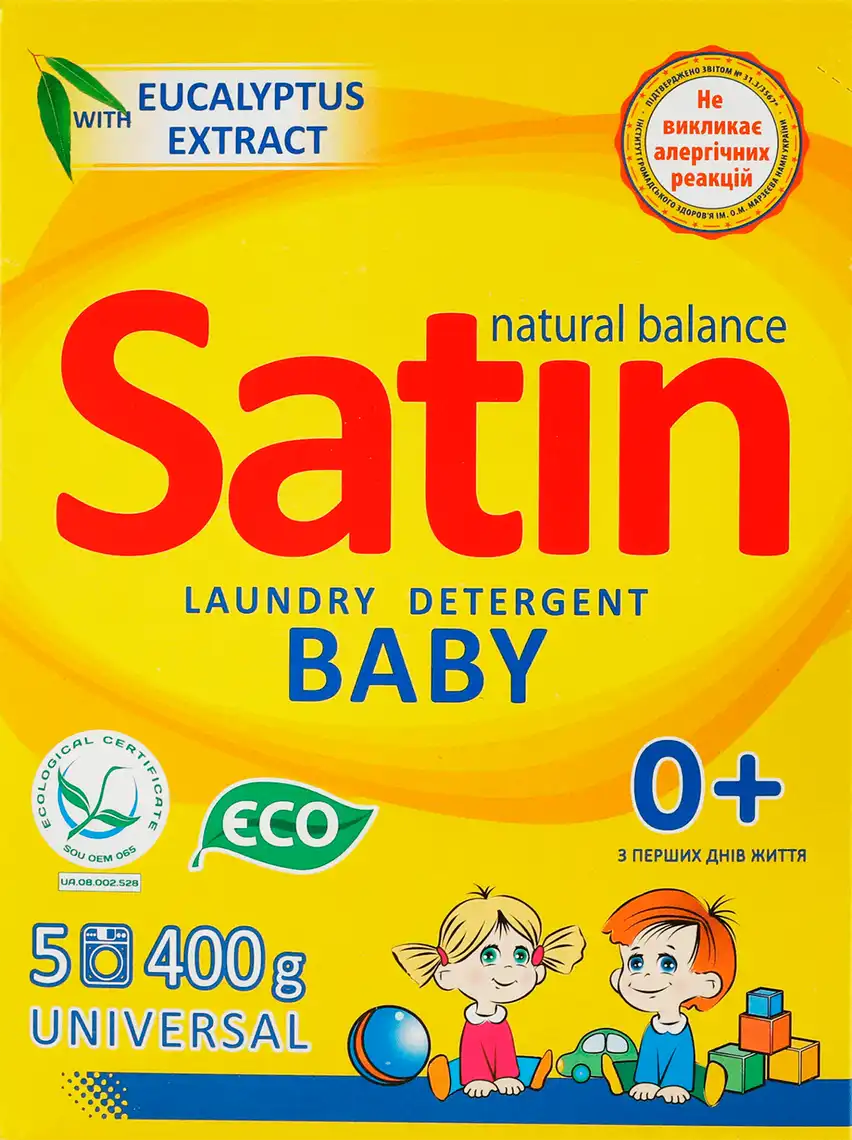 Satin Organic Balance Baby — Пральний порошок із м’якою формулою, розробленою спеціально для догляду за дитячим одягом. Безфосфатний засіб активно очищає, освіжає й пом’якшує тканини, має ненав’язливий запах і екологічно безпечний склад. Як діє? Порошок швидко розчиняється у воді, проникає всередину волокон і активно усуває забруднення, повністю виполіскується. Зберігає текстуру і форму тканин, перешкоджає вицвітанню, тому підходить для частого прання дитячих речей. Усуває неприємні запахи, надає білизні свіжості і м’якості.