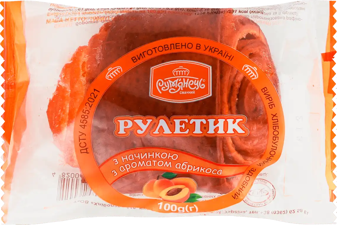 Рулетик Рум'янець абрикосовий - це солодкий кондитерський виріб, який являє собою тонкий бісквітний корж, загорнутий у рулет і наповнений абрикосовою начинкою. Рулетик має солодкий і фруктовий смак абрикосової начинки, який поєднується з ніжним і м'яким бісквітом. Текстура начинки гладка і кремоподібна, а корж - м'який і вологий. Рулетик абрикосовий часто подають як десерт або солодку закуску. Він може бути нарізаний на шматочки і прикрашений цукровою пудрою або карамеллю перед подачею. Рулетики також добре поєднуються з чашкою чаю або кави. Рулетики з абрикосовою начинкою користуються популярністю серед любителів солодощів та кондитерських виробів. Вони надають поєднання солодкості та фруктового смаку, що робить їх смачним частуванням.
