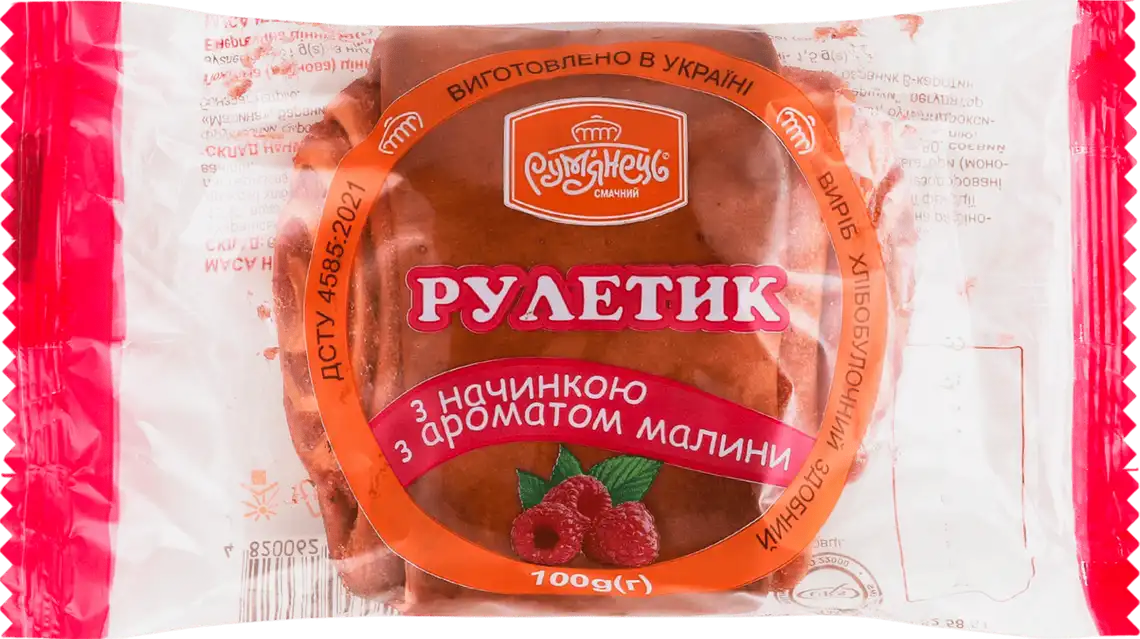Рулетик Рум'янець малиновий - це солодкий кондитерський виріб, який являє собою тонкий бісквітний корж, загорнутий у рулет і наповнений малиновою начинкою. Рулетик має солодкий і ягідний смак малинової начинки, який поєднується з ніжним і м'яким бісквітом. Текстура начинки гладка і кремоподібна, а корж - м'який і вологий. Рулетик малиновий зазвичай подають як десерт або солодку закуску. Він може бути нарізаний на шматочки і прикрашений цукровою пудрою або свіжими ягодами перед подачею. Рулетики також добре поєднуються з чашкою чаю або кави. Рулетики з малиновою начинкою користуються популярністю серед любителів солодощів і кондитерських виробів. Вони надають поєднання солодкості та ягідного смаку, що робить їх смачним частуванням.