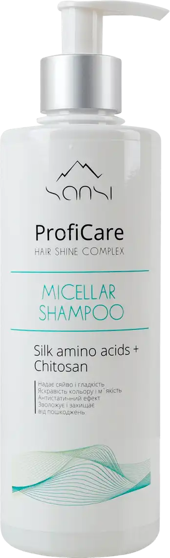 Шампунь міцелярний для волосся SANSI ProfiCare Hair shine complex. Міцелярні шампуні вважаються м'якими і щадними засобами, що очищають. Міцелі у складі делікатно та дбайливо видаляють забруднення та жир. При цьому міцелярні шампуні не руйнують гідроліпідний шар, що захищає шкіру від негативної дії ззовні. Спочатку міцелярний шампунь був задуманий як засіб для щоденного очищення від різних забруднень (за аналогією з міцелярною водою), але багато корисних властивостей зробило його універсальним варіантом.