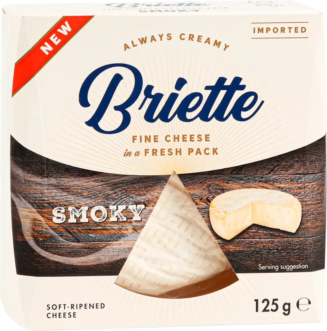 Briette Smoky – кремоподібний, м'яко дозрілий сир із чарівним димним смаком та ароматом. Білий, їстівний зовні та жовто-білий, м'який усередині з скоринкою з білої плісняви у зручній упаковці ready-to-go. Без лактози та глютена.