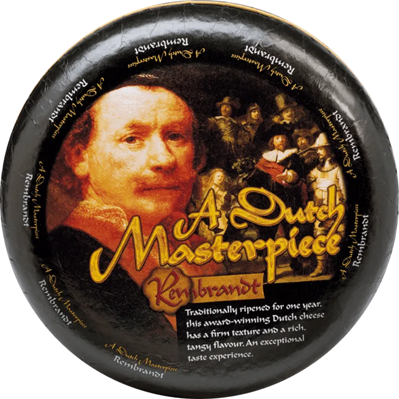 Сир Рембрандт – витриманий сир гауда із серії «Голландські шедеври» названий на честь знаменитого голландського живописця Рембрандта ван Рейна. Цей голландський сир, улюблений гурманами, витримується протягом одного року класичним природним способом. Сир A Dutch Masterpiece Rembrandt твердий, але його структура дозволить розколоти, натерти або порізати. Він має вершковий багатий аромат з легкими карамельними нотами, злегка гострим смаком, тому стане ідеальним компонентом для сирних композицій та соусів. Сир буквально тане у роті.