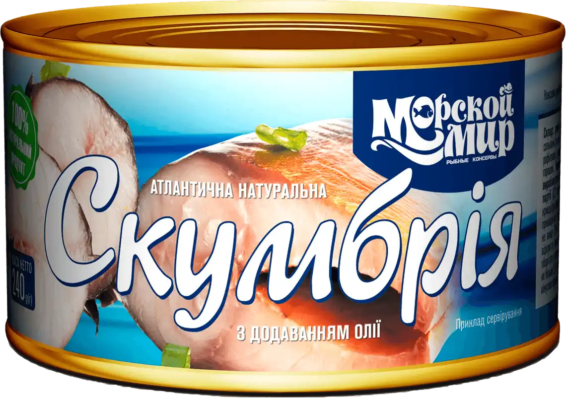 Риба (скумбрія, не менше 60 %, країна походження — Марокко), сольовий розчин (вода питна, сіль кухонна харчова — 1.4 %), олія соняшникова рафінована дезодорована виморожена (не менше 3 %), перець духмяний горошок.