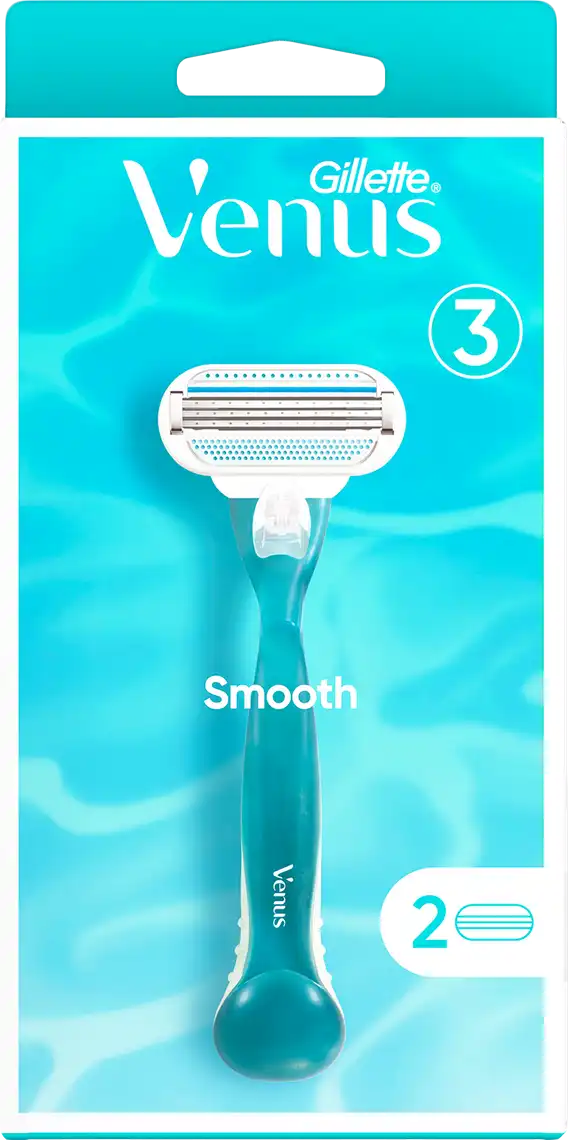 Gillette Venus Smooth – це перша бритва з трьома лезами, створена спеціально для жінок. Завдяки трьом лезам, що повторюють вигини тіла і розгладжують шкіру захисним подушечкам навколо лез, бритва забезпечує гладке і чисте гоління одним рухом. Блакитна смужка-індикатор змінює колір, повідомляючи про те, коли настав час міняти леза Venus для забезпечення оптимальної якості гоління.