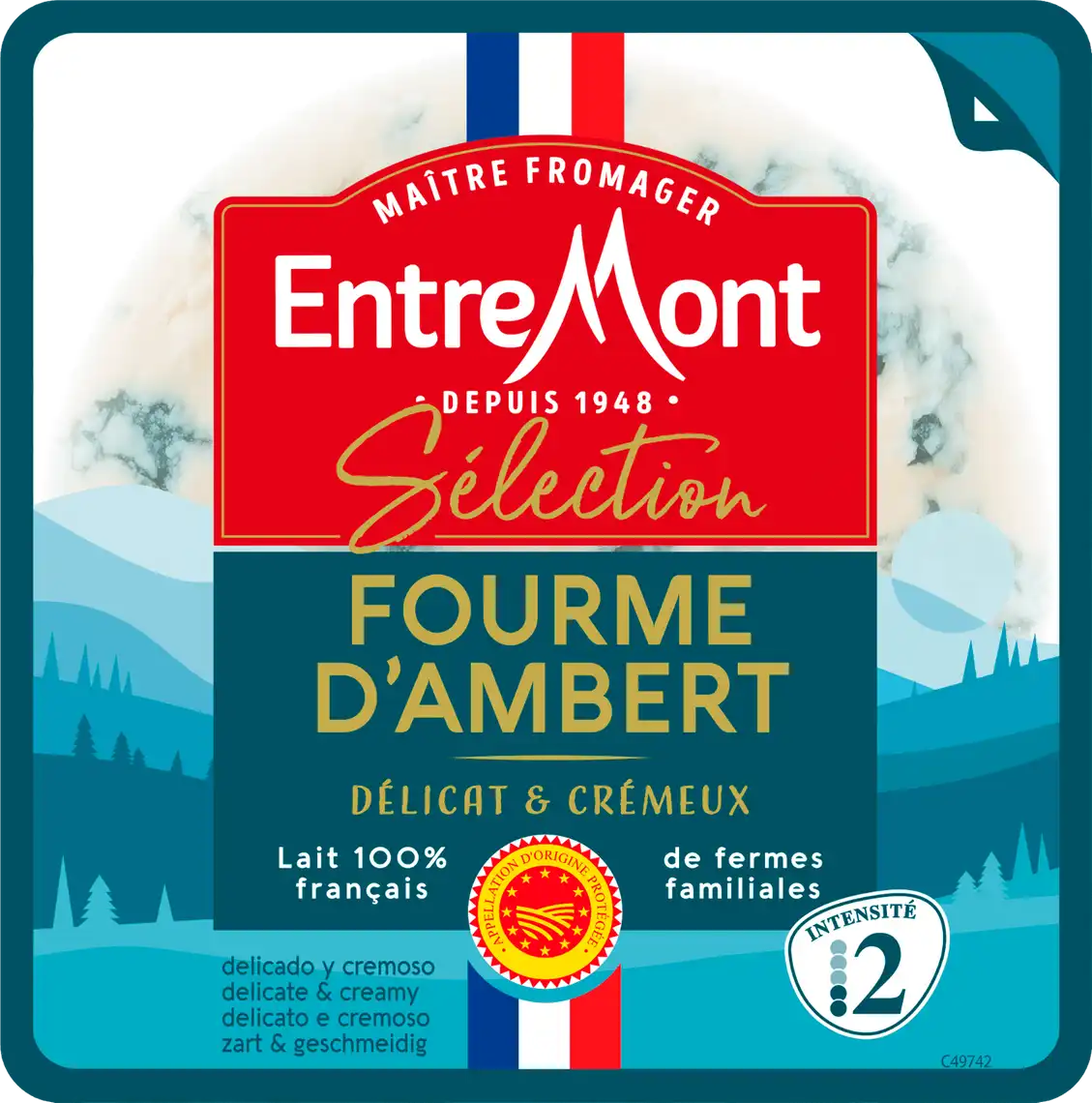 Благородний сир із блакитною пліснявою Entremont Fourme d'Ambert (Ентермонт Фурм Д'Амбер) – це найніжніший сир французького виробництва. М'який сир із блакитною пліснявою Канторель виробляється з молока гірських порід корів, яке славиться своєю підвищеною жирністю. Завдяки цьому даний вид сиру має жирність 50% і здатний здивувати Вас своїм багатогранним смаком та ароматом. Відмінною його рисою є легка солонуватість, яка дарує продукту справжню вишуканість. Текстура сиру Фурм Д'Амбер масляниста. М'якуш сиру – майже пастоподібної консистенції, досить пружна, характерного мармурово-білого кольору з блакитними розлученнями благородної плісняви. Саме пліснява переважно впливає на складний смак сиру, надаючи йому гостроти і «розбавляючи» вершкову м'якоть. Використовується сир для подачі сирних тарілок, салатів та різних соусів. Сир із блакитною пліснявою Entremont відмінно поєднується з десертними винами.
