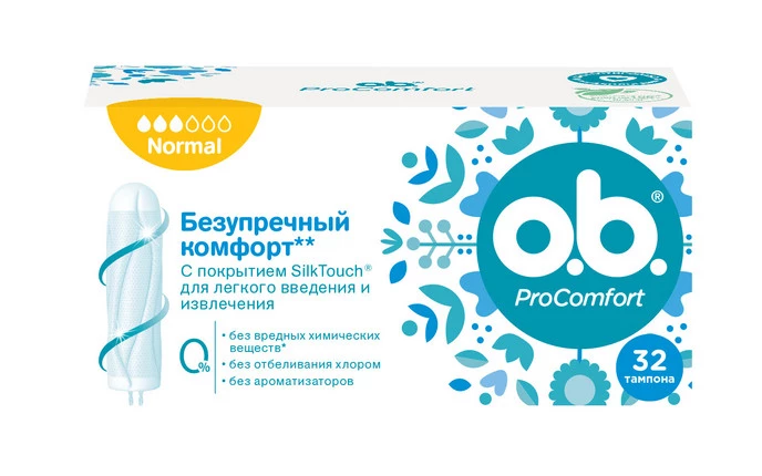 "o.b. ProComfort забезпечують легке введення і надійний захист завдяки унікальному ** покриттю SilkTouch ™, спеціальним желобкам і новій технології, для ще більш гладкої поверхні тампона o.b. ProComfort. Тампони o.b. ProComfort Normal є дуже зручними у використанні в дні з незначними і середніми виділеннями, а також для тих, хто тільки починає користуватися тампонами.Поглинаюча основа тампонів o.b. виготовлена з 100% рослинної сировини.Тампони o.b. не містять ароматизаторів, шкідливих хімічних речовин, в їх виробницстві не використовується хлор при відбілювання, протестовані гінекологами.Також завод з виробництва використовує 100% відновлювані джерела енергії для збереження екології, а у складі упаковки не меньшн ніж 75% переробленого картону.* Технологія «Смузі Текнолоджі» для ще більш гладкої поверхні тампона в порівнянні з попередньою версією даного продукту** За даними дослідження «Technical Justification», проведеного ТОВ «Джонсон & Джонсон» в листопаді 2013 року" Склад: вбираюче віскозне волокно, шовковисте покриття, шнур з поліестеру."o.b. ProComfort забезпечують легке введення і надійний захист завдяки унікальному ** покриттю SilkTouch ™, спеціальним желобкам і новій технології, для ще більш гладкої поверхні тампона o.b. ProComfort. Тампони o.b. ProComfort Normal є дуже зручними у використанні в дні з незначними і середніми виділеннями, а також для тих, хто тільки починає користуватися тампонами.Поглинаюча основа тампонів o.b. виготовлена з 100% рослинної сировини.Тампони o.b. не містять ароматизаторів, шкідливих хімічних речовин, в їх виробницстві не використовується хлор при відбілювання, протестовані гінекологами.Також завод з виробництва використовує 100% відновлювані джерела енергії для збереження екології, а у складі упаковки не меньшн ніж 75% переробленого картону.* Технологія «Смузі Текнолоджі» для ще більш гладкої поверхні тампона в порівнянні з попередньою версією даного продукту** За даними дослідження «Technical Justification», проведеного ТОВ «Джонсон & Джонсон» в листопаді 2013 року" Склад: вбираюче віскозне волокно, шовковисте покриття, шнур з поліестеру.