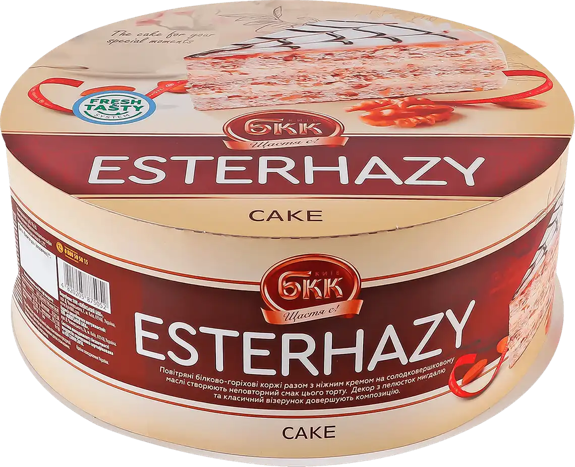 Торт БКК Esterhaz — це витончений десерт із багатою європейською історією, натхненний знаменитим угорсько-австрійським тортом «Естерхазі». В його основі — тонкі горіхові коржі, перемазані ніжним вершковим кремом з делікатним ванільно-карамельним відтінком. Виріб прикрашено фірмовою глазур’ю з характерним мармуровим візерунком із білого та темного шоколаду, що надає йому вишуканого вигляду. Смак — гармонійний і насичений: коржі з меленими горіхами мають приємну текстуру з легкою хрусткістю, крем — м’який, оксамитовий, з теплими нотками ванілі та згущеного молока. Глазур додає солодкого завершення та приємної щільності в кожному шматочку. Аромат — горіхово-вершковий, із карамельним шлейфом. БКК Esterhaz — це ідеальний торт для особливих подій або витонченого чаювання. Він сподобається поціновувачам класичних європейських десертів із багатою текстурою, глибоким смаком і елегантною подачею. Справжній витвір солодкого мистецтва.