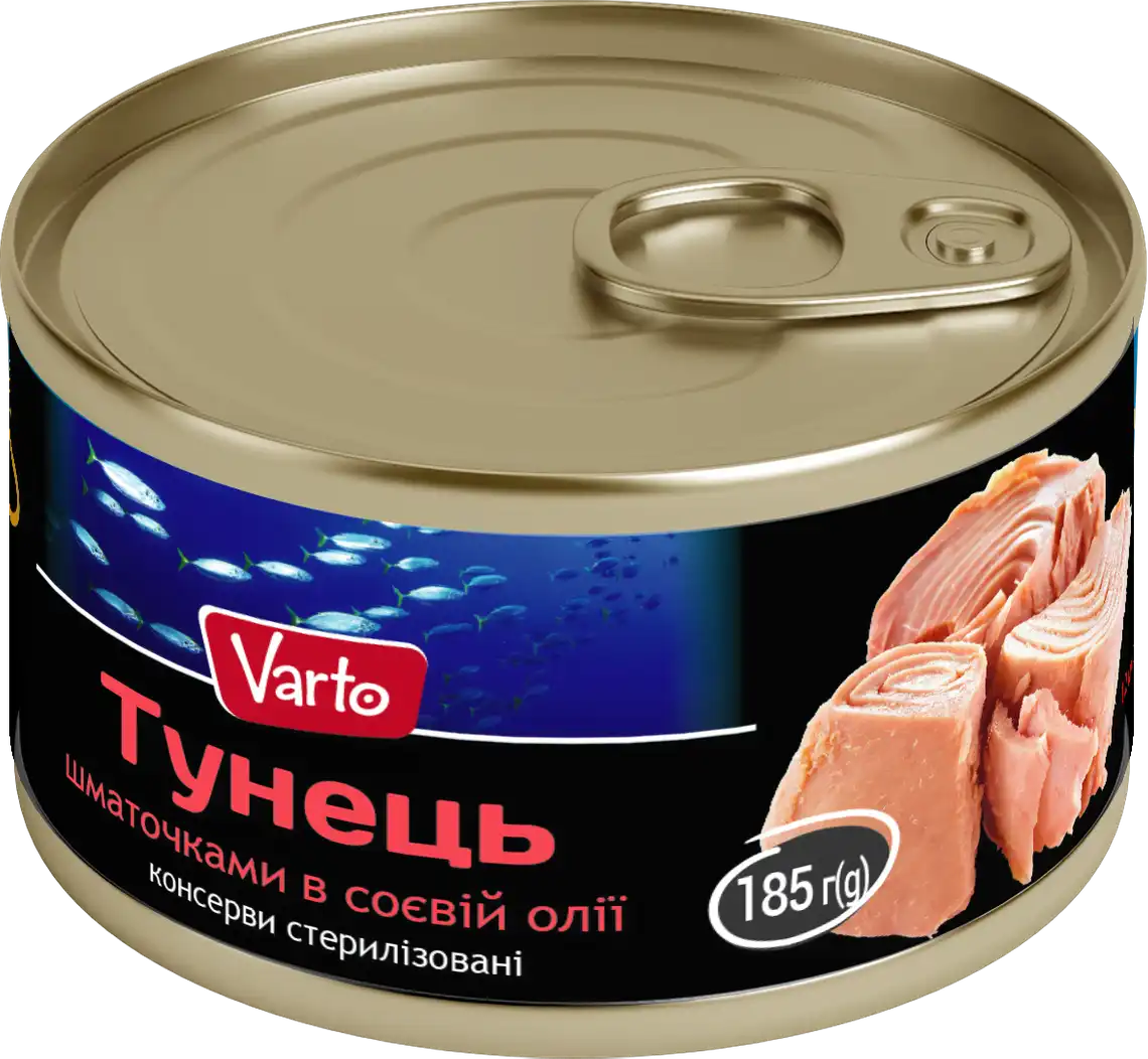 Тунець Varto шматочками в соєвій олії — це високоякісний консервований продукт, виготовлений із відбірного тунця, нарізаного апетитними шматочками та залитого натуральною рослинною олією. Цей тунець має ніжну текстуру та багатий, насичений смак, що робить його ідеальним для приготування салатів, сендвічів або пасти. Олія допомагає зберігати свіжість і соковитість тунця, додаючи стравам додаткового смакового акценту. Varto тунець в олії — це зручний і поживний продукт, багатий на білок та корисні омега-3 жирні кислоти, який може стати основою для багатьох страв або використовуватися як самостійний перекус.