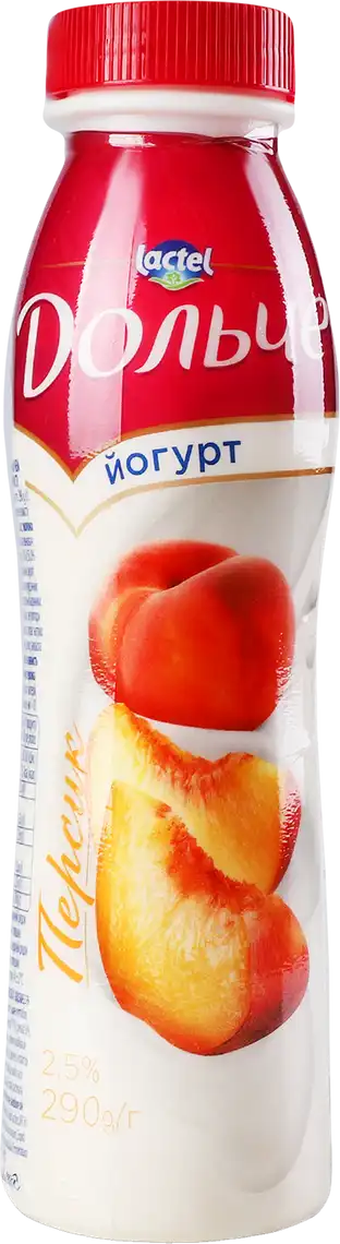 Апетитний питний йогурт від торгової марки «Дольче» - це смачний ніжний продукт, який виробляється з натурального молока високої якості. Він подарує Вам справжнє задоволення завдяки своєму чудовому смаку і аромату стиглого персика. Йогурт «Дольче» швидко вгамує спрагу і відчуття голоду в найнеобхідніший момент. Жирність продукту становить 2.5%. Він представлений в зручній пластиковій пляшці.