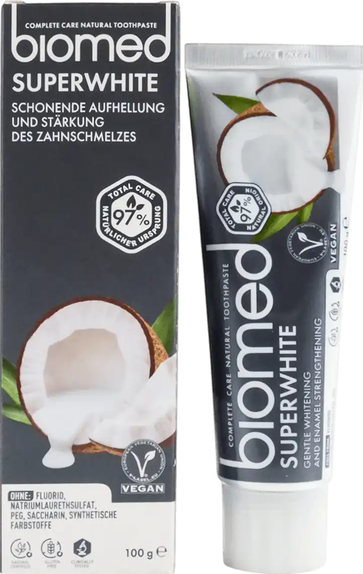 У дитинстві наші мами і тата говорили про те, як важливо стежити за гігієною порожнини рота. Нас вчили чистити зуби регулярно, щоб підтримувати красу і здоров'я зубів. Регулярне чищення захищає весь організм від безлічі бактерій і мікробів. Зміцнююча зубна паста «Супервайт» Biomed Superwhite допоможе вам зберігати мікрофлору порожнини рота в ідеальному стані. Відома торговельна марка Biomed випустила приголомшливий і натуральний продукт, який знайшов вже безліч шанувальників по всьому світу. Зубна паста містить в собі унікальний комплект Sp.White System®, який забезпечує дбайливе і безпечне відбілювання. Завдяки натуральним ферментам з папайї та екстракту кокоса, паста освітлює емаль, не пошкоджуючи її, розщеплює наліт і робить поверхню зубів гладкою. Приємний і ненав'язливий аромат кокоса допоможе почати ранок з правильного настрою. При постійному використанні, вже через чотири тижні, ви помітите, що ваші зубки стали більш світлими і красивими.