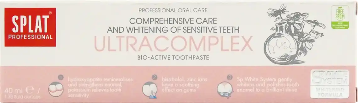 Зубна паста Professional Ultracomplex від компанії Splat дозволить всім власникам чутливих зубів забути про свої побоювання і страхи перед використанням засобів по догляду за порожниною рота, адже її м'яка формула надає максимально дбайливе і делікатне вплив. Її формула заснована на інноваційній системі Sp.White System®, яка розроблена спеціально для чутливих зубів. Завдяки цьому, а також містяться в складі ферментів папайї з Полідоном®, паста безпечно відбілює зуби, розщеплює зубний наліт і запобігає появі зубного каменю. Знаходяться в складі калій і цинк добре зміцнюють зуби, збільшують щільність емалі, а також мають протизапальну дію на ясна. Завдяки всім цим факторам, паста без будь-яких неприємних і хворобливих відчуттів помітно відбілює і зміцнює зуби, полірує їх і надовго залишає дихання свіжим. Продукт не містить фтору.
