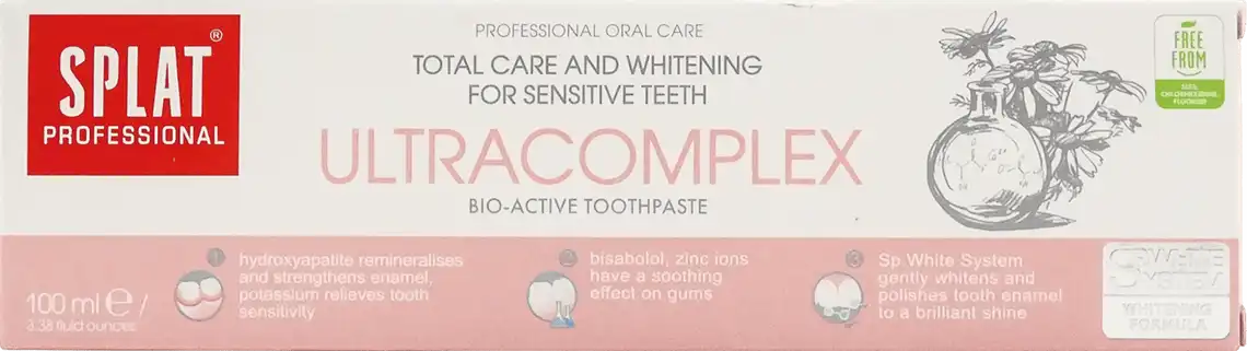 Зубна паста Professional Ultracomplex від компанії Splat дозволить всім власникам чутливих зубів забути про свої побоювання і страхи перед використанням засобів по догляду за порожниною рота, адже її м'яка формула надає максимально дбайливе і делікатне вплив. Її формула заснована на інноваційній системі Sp.White System®, яка розроблена спеціально для чутливих зубів. Завдяки цьому, а також містяться в складі ферментів папайї з Полідоном®, паста безпечно відбілює зуби, розщеплює зубний наліт і запобігає появі зубного каменю. Знаходяться в складі калій і цинк добре зміцнюють зуби, збільшують щільність емалі, а також мають протизапальну дію на ясна. Завдяки всім цим факторам, паста без будь-яких неприємних і хворобливих відчуттів помітно відбілює і зміцнює зуби, полірує їх і надовго залишає дихання свіжим. Продукт не містить фтору.