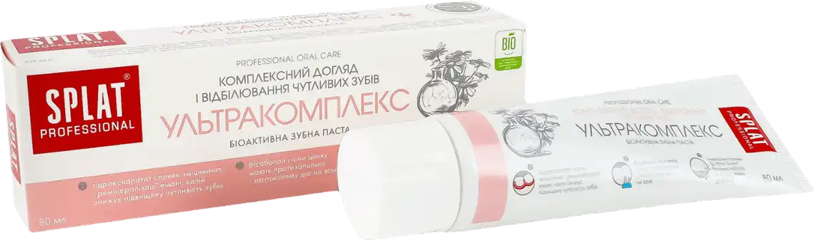 Зубна паста Professional Ultracomplex дасть змогу всім власникам чутливих зубів забути про свої побоювання і страхи перед використанням засобів для догляду за порожниною рота, адже її м'яка формула чинить максимально дбайливий і делікатний вплив. Її формула заснована на інноваційній системі Sp.White System, яка розроблена спеціально для чутливих зубів. Завдяки цьому, а також ферментам папайї з Полідоном, що містяться в складі, паста безпечно відбілює зуби, розщеплює зубний наліт і запобігає появі зубного каменю. Калій і цинк, що містяться в складі, добре зміцнюють зуби, збільшують щільність емалі, а також мають протизапальну дію на ясна. Завдяки всім цим факторам, паста без жодних неприємних і хворобливих відчуттів помітно відбілює і зміцнює зуби, полірує їх і надовго залишає подих свіжим