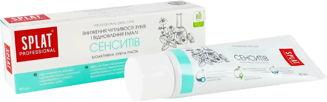 Зубна паста Splat Professional Sensitive — це спеціалізований засіб для дбайливого догляду за чутливими зубами та яснами. Її м’яка, але ефективна формула розроблена для зменшення чутливості зубів, зміцнення емалі та забезпечення комплексного захисту порожнини рота. Активні компоненти, такі як калійні солі, допомагають знижувати больову реакцію на холодні, гарячі чи кислі продукти, блокуючи нервові закінчення. Гідроксиапатит кальцію сприяє ремінералізації емалі, зміцнюючи її структуру та знижуючи ризик розвитку карієсу. Завдяки вмісту натуральних екстрактів, паста також має протизапальні властивості, заспокоює ясна і запобігає їх подразненню. Splat Professional Sensitive м’яко очищує зуби від нальоту, не пошкоджуючи емаль, і залишає приємне відчуття свіжості надовго. Це ідеальний вибір для людей із підвищеною чутливістю зубів, які шукають ефективний і делікатний догляд, що забезпечує здорову посмішку та комфорт щодня.